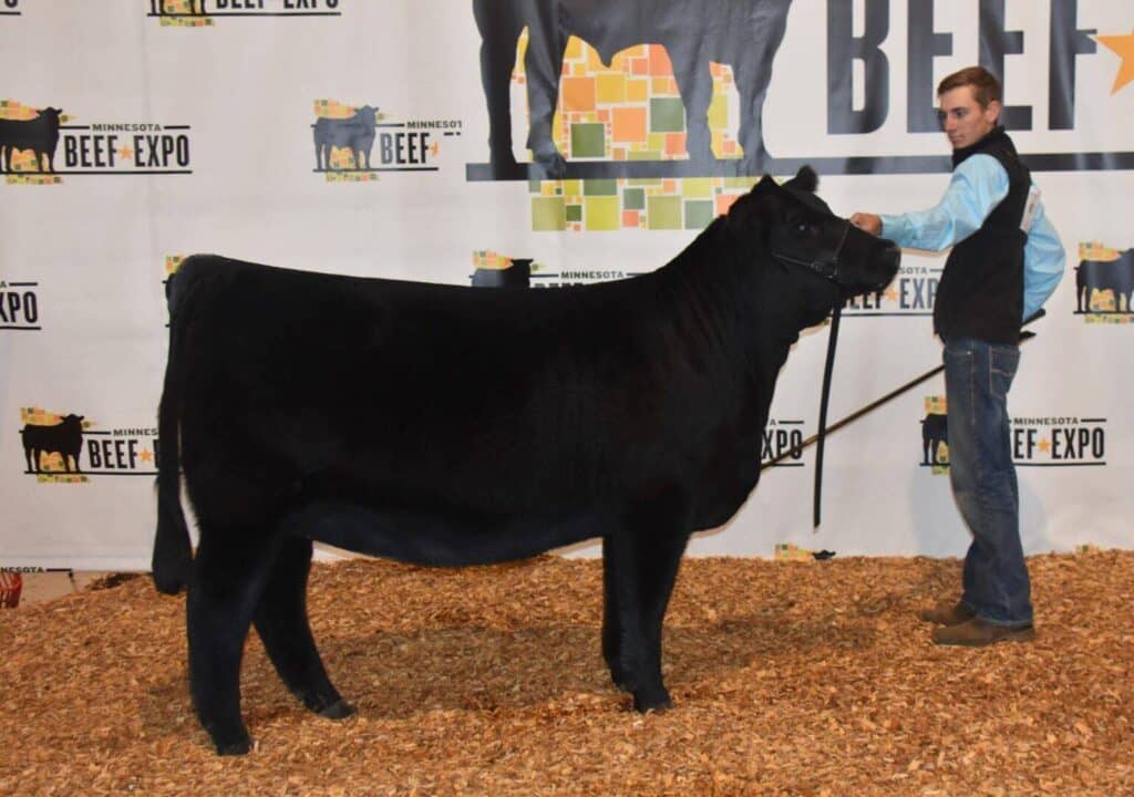 Grand champion Limousin female and 4th overall: CHHF Holly 07H, 5/2/2021, 76% Limousin, double black, double polled, sired by ROMN Floyd Mudkenkey 101F, out of CHFF Fiona 802F ET, exhibited by Beau Peine, Hastings, Minn.