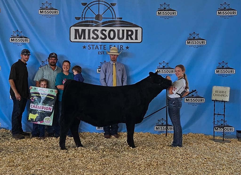 Reserve Grand Champion Heifer: PCC JKSM Fantasy, 3/15/2023, 45% Lim-Flex, double black, double polled, sired by SCC SCH 24 Karat 838, out of HSF Your Fantasy, exhibited by Saydi Hagedorn, Stover, Mo. Division IV Champion.